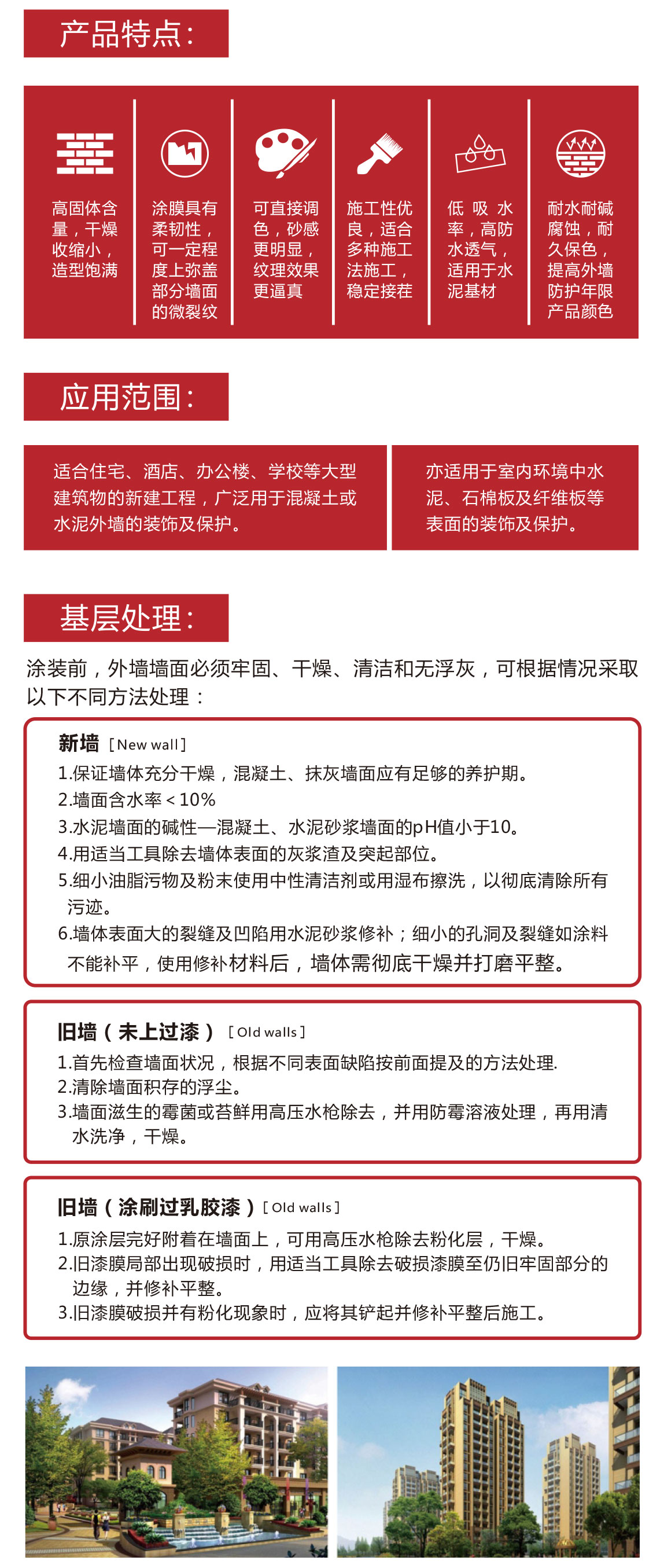 質(zhì)感漆是以天然砂石與合成樹(shù)脂為主體的砂壁狀涂料,具有優(yōu)良的耐候性和柔韌性,可長(cháng)時(shí)間保護建筑物的美 觀(guān),該產(chǎn)品顏色和紋理豐富,具有高強防水、功能抗污、彈性抗裂、低溫柔性、耐久保色、抗菌防霉、質(zhì)感分 明的優(yōu)異特性,可以讓用戶(hù)涂飾出各種粗狂別致的砂狀效果。